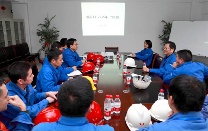 ? ??隨后,韋董一行來到公司柳東工廠進行調研,在參觀生產現(xiàn)場后與柳東管理團隊進行座談。柳東工廠廠長黃輯匯報了2015年柳東工廠運行情況及2016年業(yè)務突破。