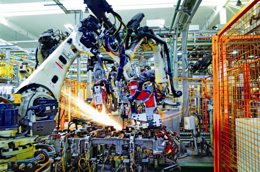 ?????????? ???? 7月9日,廣西汽車集團(tuán)自動(dòng)化焊接生產(chǎn)線的工業(yè)機(jī)器人在焊接汽車構(gòu)件。該集團(tuán)近三年增加機(jī)器人300多臺(tái),建成18條自動(dòng)化生產(chǎn)線,凝成多種重要汽車部件的生產(chǎn)能力。今年,1-6月份,該集團(tuán)汽車制造業(yè)務(wù)收入實(shí)現(xiàn)78.02億元,同比增長15%。使用機(jī)器人已成為柳州80%以上工業(yè)企業(yè)的意愿。